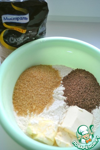 12) Включаем духовку и готовим обсыпку. Для этого смешиваем муку, сахар, холодное сливочное масло, тертый шоколад. Рубим масло ножом на мелкие кусочки, затем растираем эту массу руками до образования крошек.