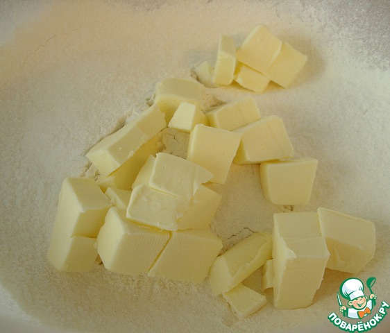 Просеянную муку перетереть в крошку пальцами с холодным сливочным маслом.