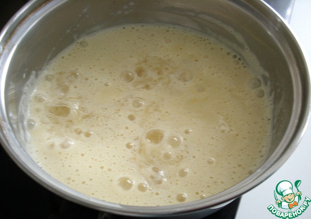 Сливки разогреть в сотейнике (не кипятить), желтки слегка взбить с сахаром (20 гр) и с ванильным сахаром (10 гр, можно заменить обычным). Тонкой струйкой влить горячие сливки, быстро перемешать и опять поставить на огонь.