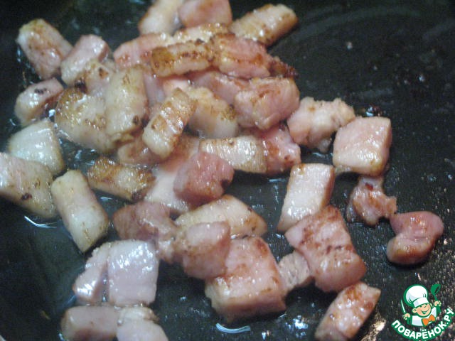 Обжарить бекон на сковороде без добавления масла, пока жир не расплавится.
