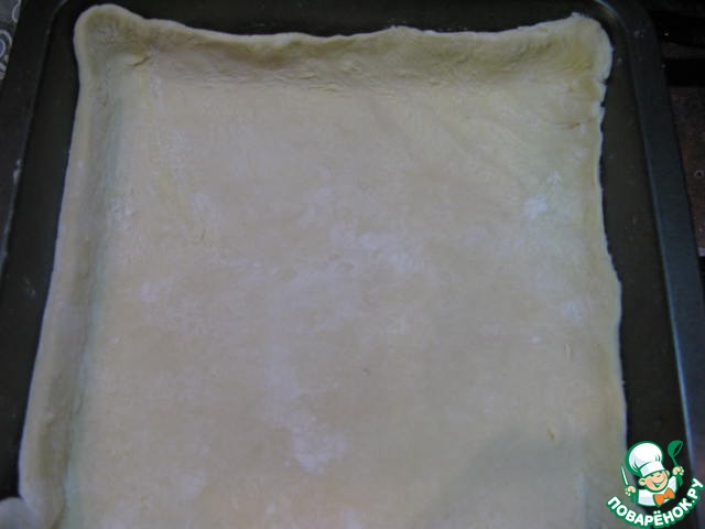 Предварительно размороженное тесто слегка раскатать и выложить в форму, чтобы получились бортики.