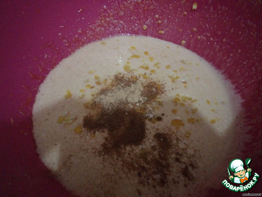 Кладем туда цедру двух лимонов, корицу и имбирь, разрыхлитель, снова взбиваем.