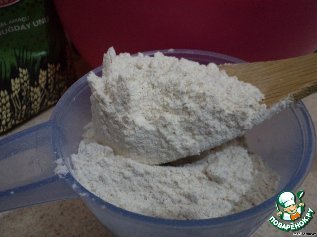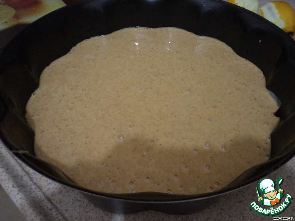 В это время добавляем к тесту муку - 1 стакан. Мука именно серая, неоднородная, в этом вся прелесть и "осенний" вкус пирога. Если у вас нет такой муки, смешайте в равном количестве белую муку высшего сорта и ржаную.