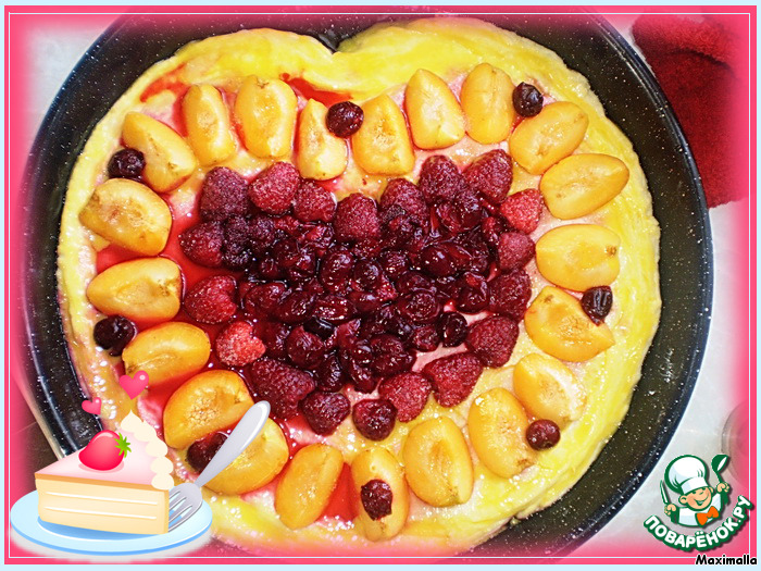 Из вишен вынуть косточки, слить выделившийся сок, смешать их с крахмалом и 1 ст.л. сахара (с крахмалом вишни не так сильно будут пускать сок). Малину промыть. Этот шаг не фотографировала, так как была вся в вишневом соке!))
