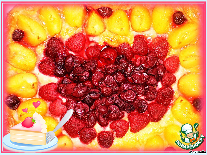 Поднявшееся тесто распределить руками на смазанном маслом противне в форме сердца. Идеальный вариант - сазы выпекать в форме-сердечке. Сделать небольшое уплотнение - ободок по краям. Вдоль ободка выложить абрикосовые дольки, затем малину и в центре - вишни. Посыпать начинку сахаром. Снова накрыть полотенем и оставить на полчаса подходить.