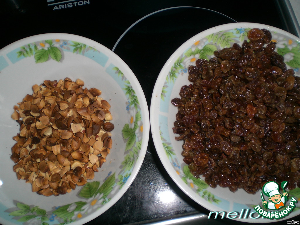 Обжарить арахис и разрезать на 4 части. Изюм ошпарить кипятком.