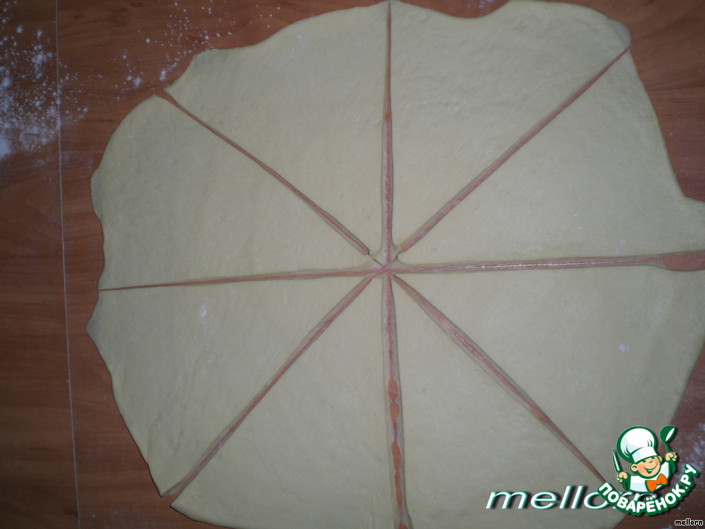 Тесто разделить на 5 частей. Из каждой части раскатать круг и разделить на 8 секторов.