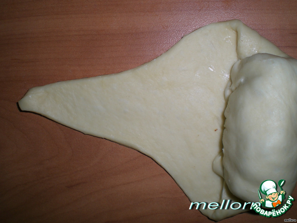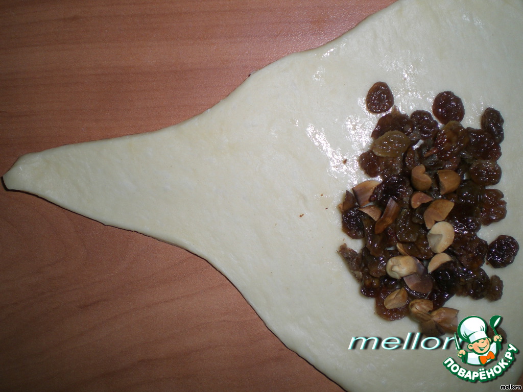 На широкий конец каждого сектора положить как можно больше начинки (тесто эластичное и хорошо тянется) изюма и арахиса.