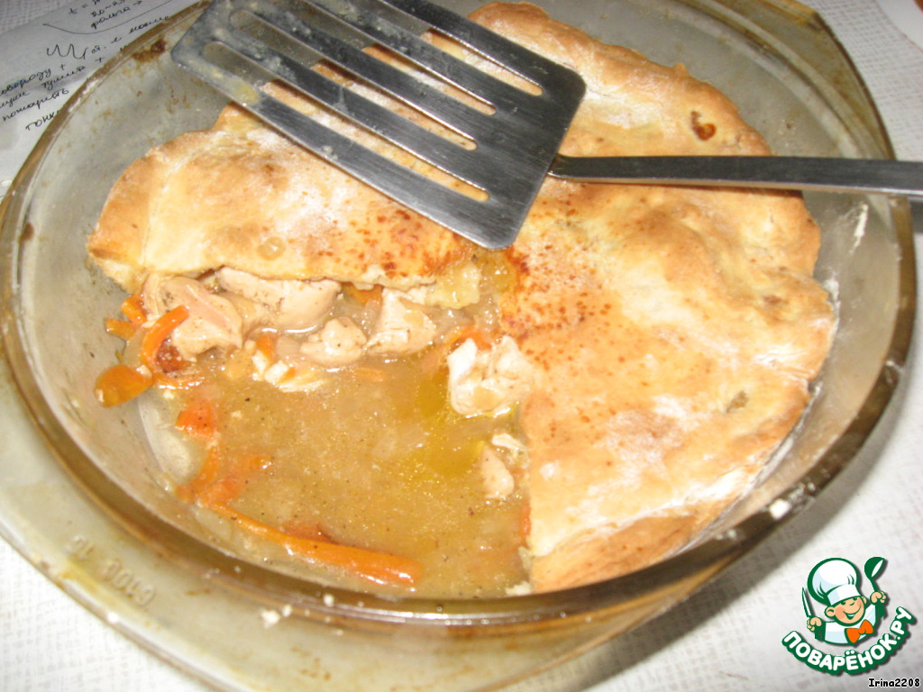 Тесто достать из холода, раскатать (присыпая при надобности мукой) в круг и накрыть форму. Края формы смазать водой, лишнее тесто обрезать (у меня его не было т.к. само тесто получилось нежное и мягкое). Посередине сделать дырку для выхода пара. Духовку разогреть до 180-200 градусов.