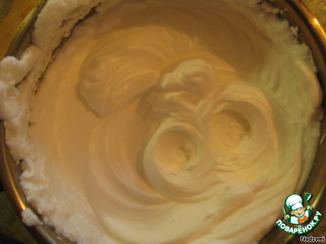 Белки взбиваем в крепкую пену, добавляем оставшийся сахар и снова взбиваем.