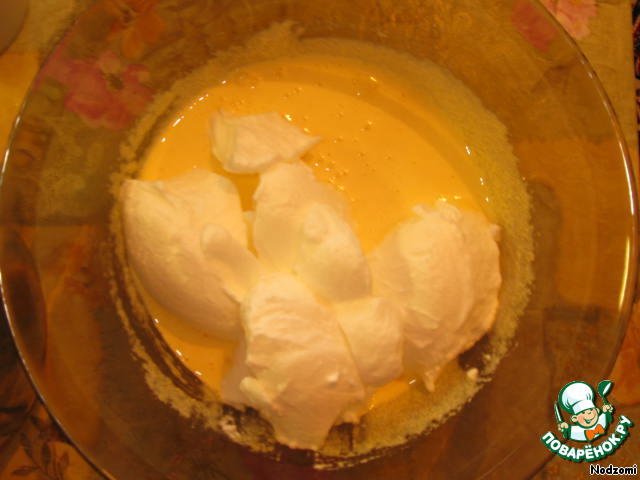 В желтки выкладываем около 1/3 белков и осторожно перемешиваем. Всыпаем муку, перемешиваем.