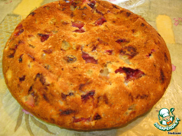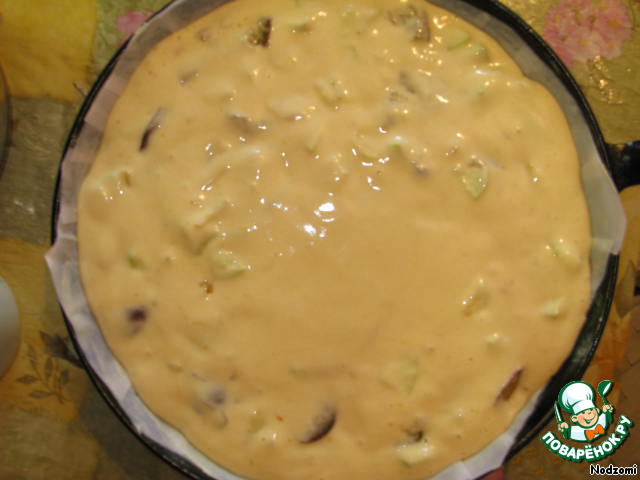 Всё перемешиваем и выливаем в форму. Здесь есть один нюанс - если фрукты сочные, тяжёлые лучше сделать "подушку" из яблок, тогда фрукты будут равномерно распределены по всему пирогу, если же этого не сделать, они могут опуститься на дно и залечь там жидковатой массой. Подушка делается так: небольшая часть теста выливается в форму, на неё выкладываются дольки яблок (по всей площади), остальные фрукты перемешиваются с оставшимся тестом и выливаются на "яблочную подушку".