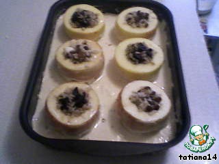Форму для выпечки смазать (обычное раст. масло), начинить яблочки нашим фаршем: 3 яблочка одним, 3 яблочка другим. У меня начинка немного осталась (знаете, что с ней надо сделать). Поставить яблоки в форму.