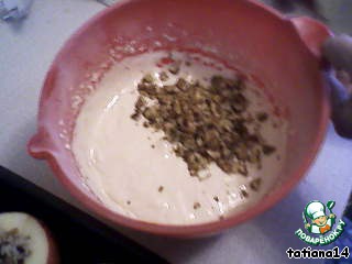 Делаем тесто. Взбить яйца с сахаром до густоты, в муку добавить разрыхлитель и вмешать в яйца. Добавить оставшиеся орехи, тесто готово.