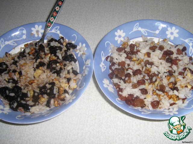 В рис добавить мед, если густой, немного подогреть, чтобы растаял, корицу, орехи. Разделить рис пополам, в одну половину - чернослив, в другую - изюм.