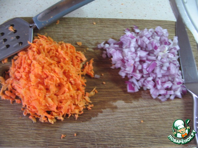 Лук порезать мелкими кубиками, морковь натереть на терке и обжарить в сковороде в нгебольшом количестве масла.