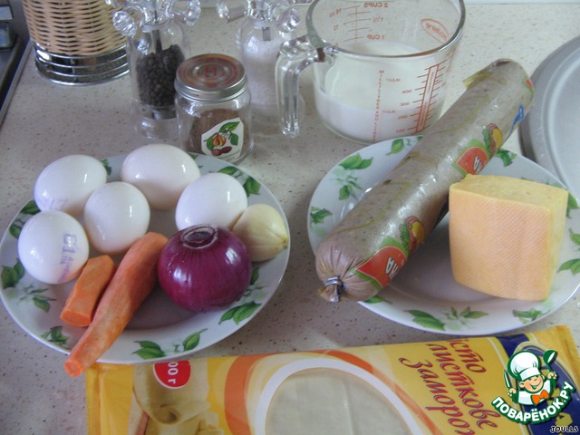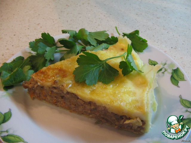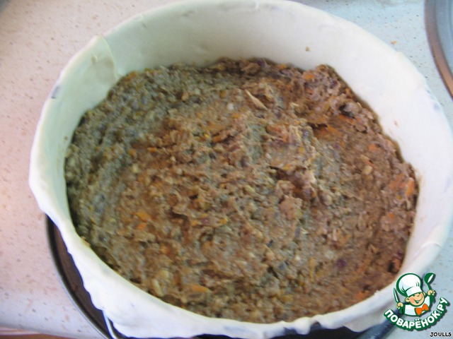 Тесто раскатать в пласт и выложить в форму так, чтобы края свисали. Маленький совет - не используйте разъемную форму, т.к. жидкий омлет будет подтекать под дно формы. Лучше взять прямоугольную цельную форму небольшого размера. На тесто выложить фарш и разровнять лопаточкой.