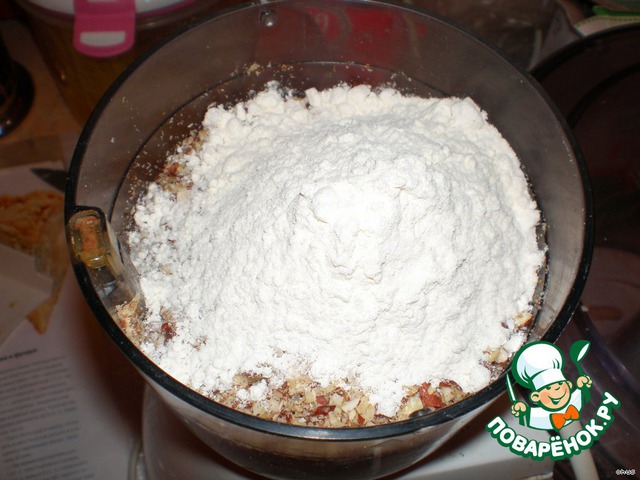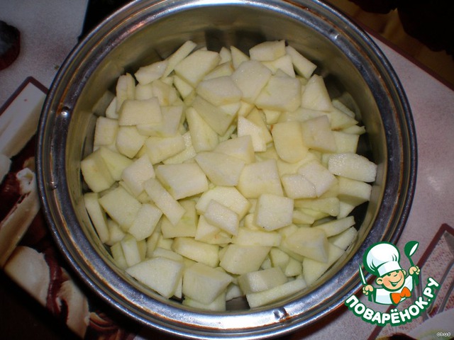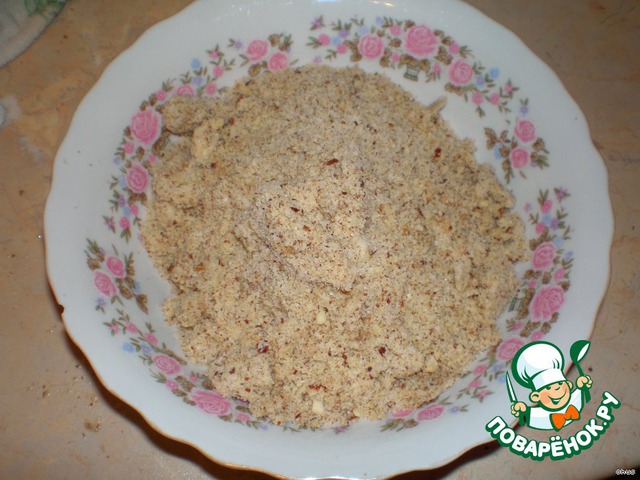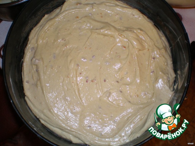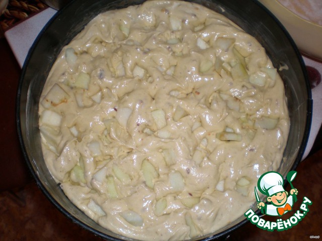 Равномерно распределить тесто поверх яблок. Выпекать при температуре 200 градусов около 30 мин. По прошествии половины времени выпекания, посыпать сверху крошкой, которая готовится так: