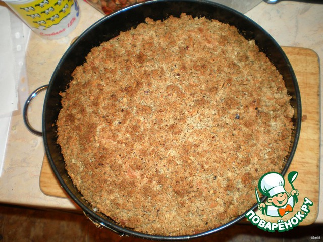 Полученной крошкой и посыпаем пирог. Выпекаем еще половину времени.