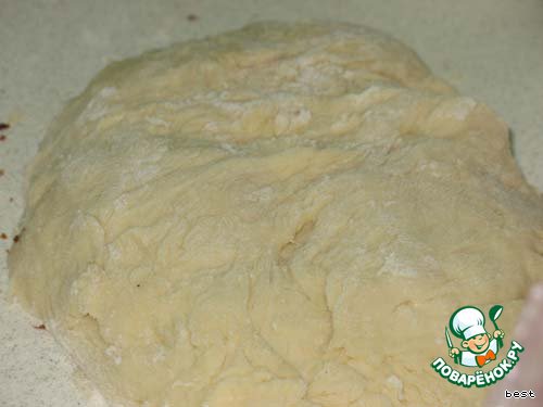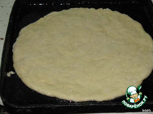 Тесто разделить на 2 части. Одну раскатать в круг и выложить на противень.