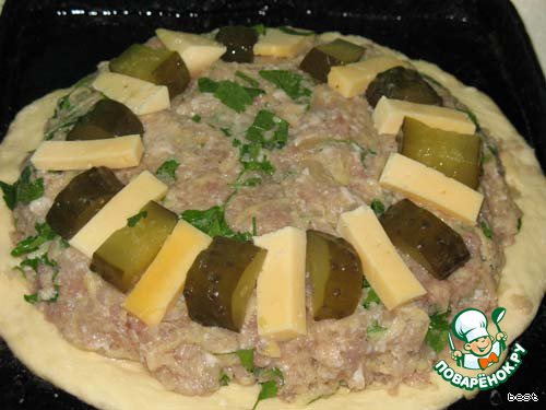 Выложить в центре круга начинку горкой. В начинку выложить, утапливая, соленый огурец и брусочками нарезанный сыр.