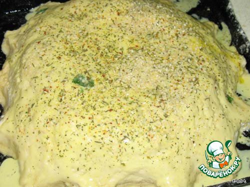 Смешать желток с молоком, смазать пирог, посыпать кориандром и кунжутом. Вилкой сделать проколы в нескольких местах. Выпекать пирог 45 минут при 180°С , в заранее разогретой духовке.