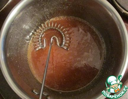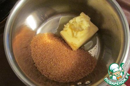 В кастрюльку засыпаем оставшийся сахар, кладем кусок сливочного масла.