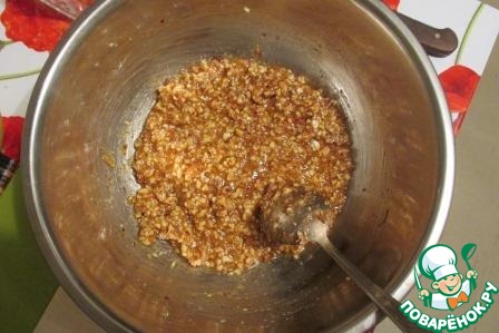 Сахарно-масляную смесь выливаем в молотые орехи и перемешиваем.