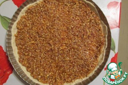Тесто раскатываем в очень тонкий пласт. Раскатывать можно на листе пергамента, потом лист с тестом перевернуть на форму, сформировать бортик, лишнее тесто отрезать ножницами, а можно из раскатанного на доске пласта теста вырезать круг по диаметру съемного дна невысокой формы с запасом в 2-3 см для формирования небольшого бортика и аккуратно перенести в форму.
