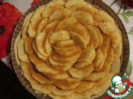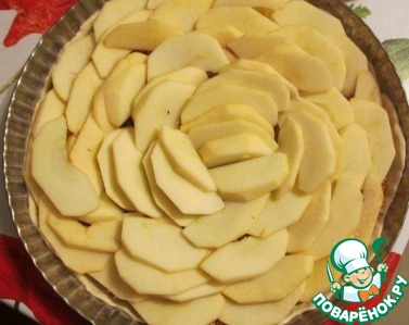 Яблоки моем, очищаем от кожуры и семенных коробочек и нарезаем тонкими ломтиками. Ломтики плотно укладываем на пирог.