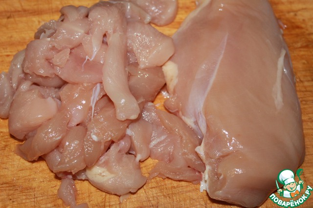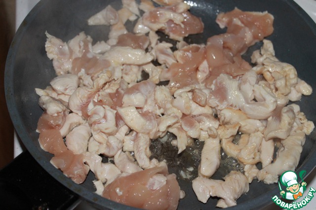 Уложить на обжаренную куриную грудку и отправить в разогретую до 180 градусов духовку на 30 минут.