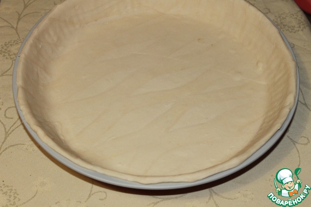 Слоеное тесто тонко раскатать и уложить на смазанную растительным маслом форму
