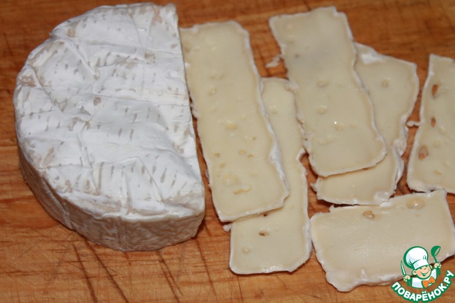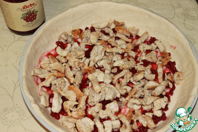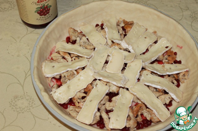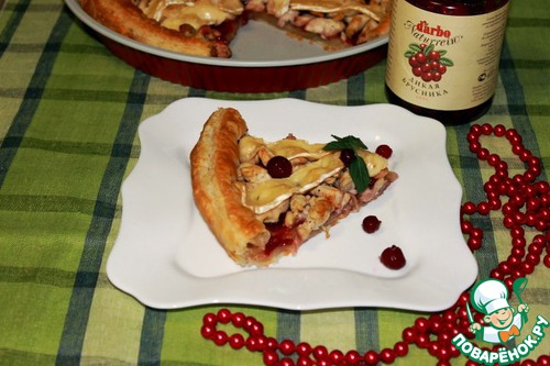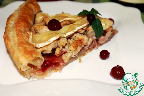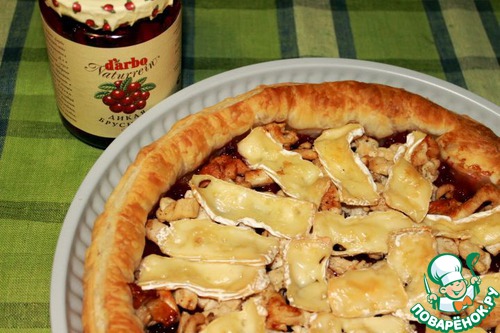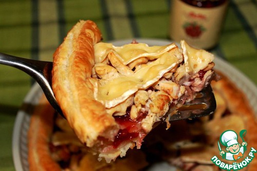 Открытый пирог с куриной грудкой, брусничным соусом и сыром камамбер