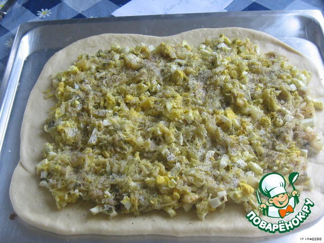 Часть теста раскатать, положить начинку (я сверху поперчила, т. к., когда делала капусту, забыла это сделать)