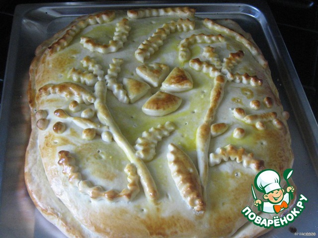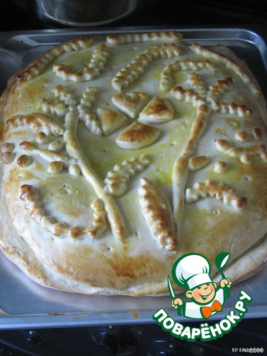 Накрыть вторым пластом теста, защипать края и украсить по желанию. Как украсила я - можете глянуть и посмеяться)