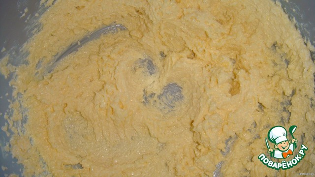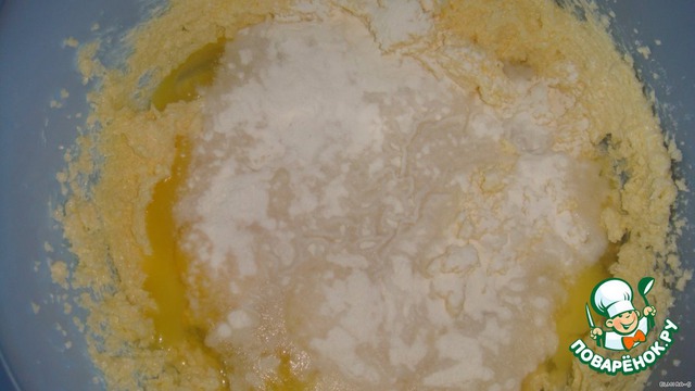 Добавить яйца, разрыхлитель, муку и замесить мягкое тесто.
