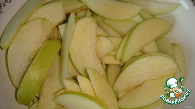 У яблок удалить семена, нарезать тонкими ломтиками.