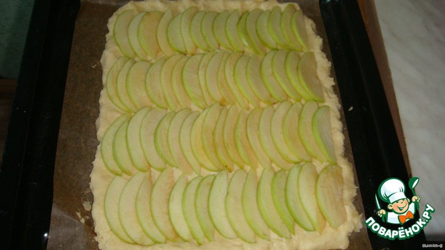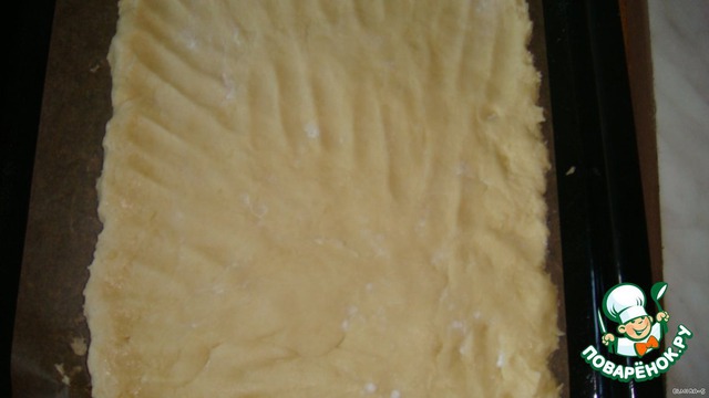Разделить тесто на две неравные части. Меньшую часть оставить для украшения, большую часть выложить на противень (постелите пекарскую бумагу), руками сформируйте пласт.