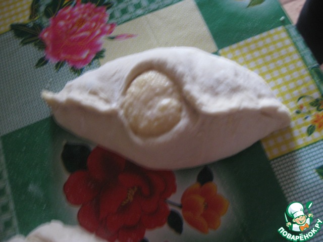 Поскольку начинка слегка жидковата, залепить такой пирожок, что бы он был красивым, не совсем просто. Я ложу лепешку на стол, на нее ложу начинку, а затем с двух сторон, аккуратно залепляю, слегка растягивая тесто. Вот такой пирожок должен получиться. Всего из указанного количества ингредиентов получается 15 пирожков, как раз на один противень. Оставляем наши пирожки на 20-30 минут, что бы подошли. Затем смазываем яйцом и выпекаем в разогретой духовке 30 -40 мин. (смотрите по своей духовке) при температуре 180-200 градусов.