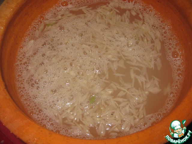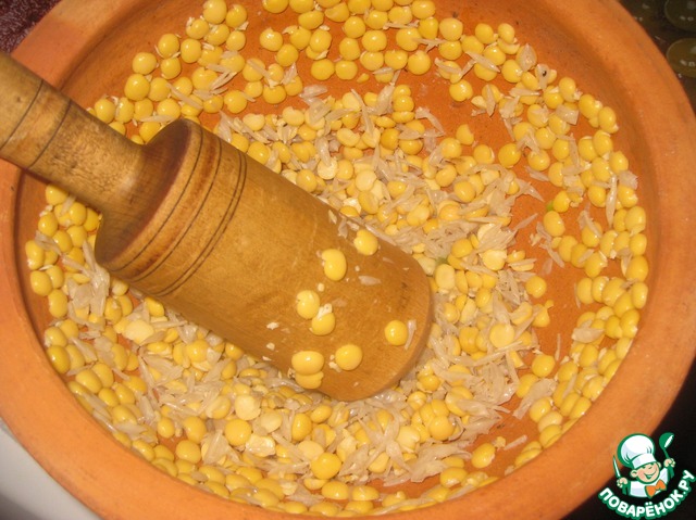 Пока тесто подходит, займемся горохом. Моем его после замачивания и кладем в "макитру". Затем с помощью "макогона" трем, что бы снять шелуху.