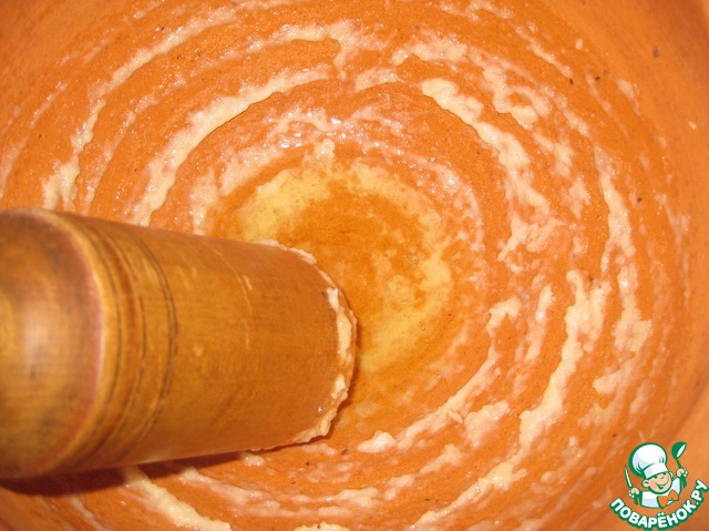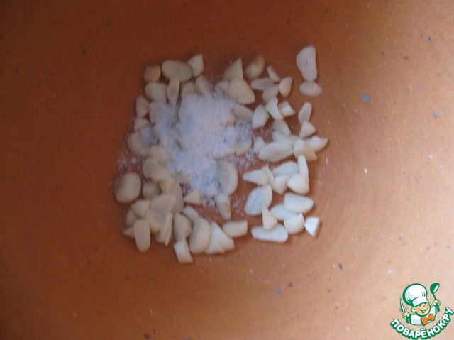 Пока пекутся пирожки и пахнут на весь дом)), готовим чесночный соус. Для этого берем небольшую головку чеснока, чистим его и с помощью той же "макитры" перетираем с солью в кашицу.