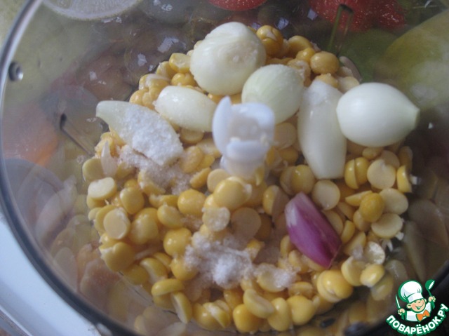 Теперь с помощью блендера, сбиваем горох с луком и солью до однородной консистенции. У меня маленький блендер, поэтому я делаю это в два этапа. В большей блендер можно смело загружать всю порцию. Лука должно быть много, приблизительно 1/3 всего гороха (смотрите по своему вкусу).