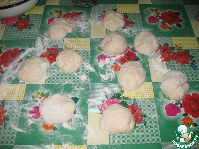 Смазываем протвень подсолнечным маслом и начинаем лепить пирожки. Делим тесто на небольшие шарики.
