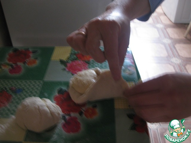 Раскатываем их скалкой (я просто формирую лепешку руками) и лепим пирожки. На один пирожок нужно приблизительно 1 ст. л. начинки.