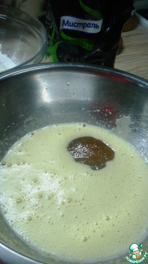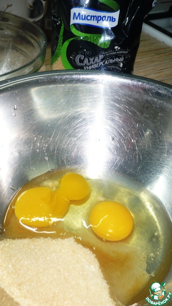 Яйца взбить с сахаром добела. Постепенно добавить масло.