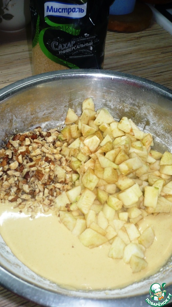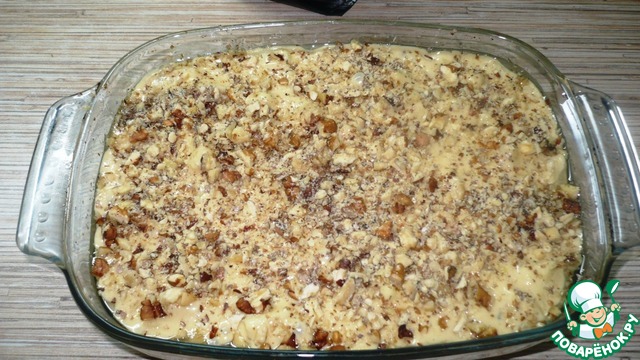 Тесто выложить в смазанную маслом форму, сверху посыпать второй половиной орехов. Форма у меня 17х23 см. Выпекать при температуре 200С 45 минут. Готовность проверить деревянной шпажкой.