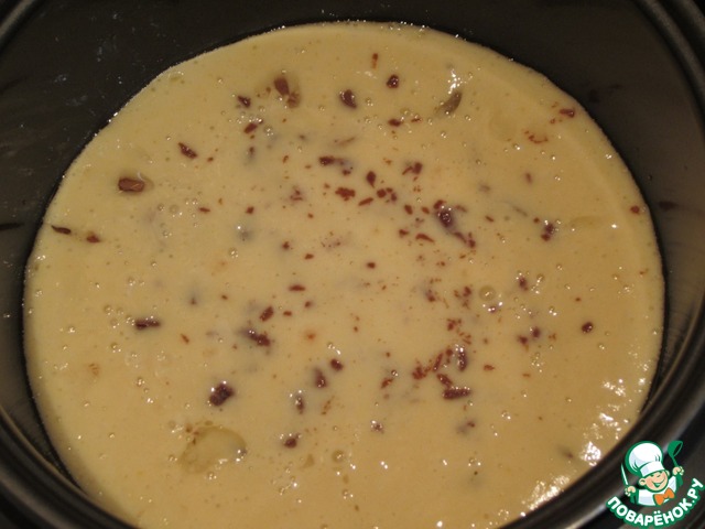 Яйца с сахаром хорошенько взбиваем миксером. Добавляем соду в молоко и хорошо перемешиваем, добавляем к яйцам и снова перемешиваем, затем добавляем муку, ванилин и снова хорошо перемешиваем для получения однородной массы. Смазываем мультиварку маслом и вливаем наше жиденькое тесто. Сверху "вкрапываем" варенье или насыпаем изюм и нарезанные 1/2 плитки шоколада небольшими кусочками, а можно сделать с 2-3 яблоками (я делала с шоколадом и изюмом).