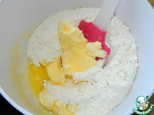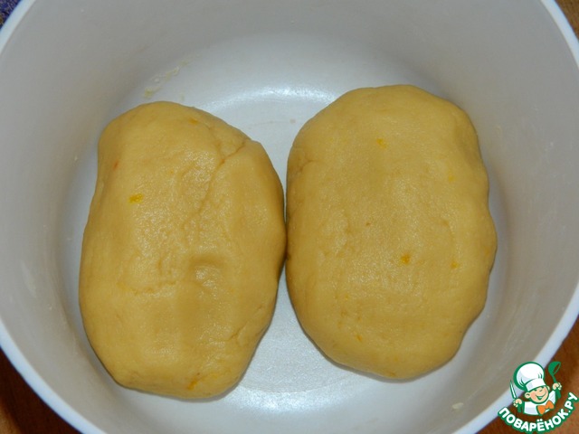 Готовое тесто разделить на 2 равные части и убрать на полчасика в холод.