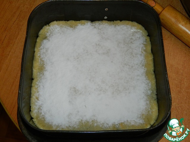 Тесто раскатать по дну формы. Я его раскатывала прямо в форме, сняв с неё бока. Присыпать крахмалом.
