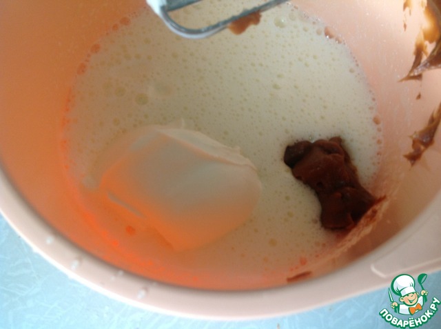 Добавить сметану и вареную сгущенку, взбить